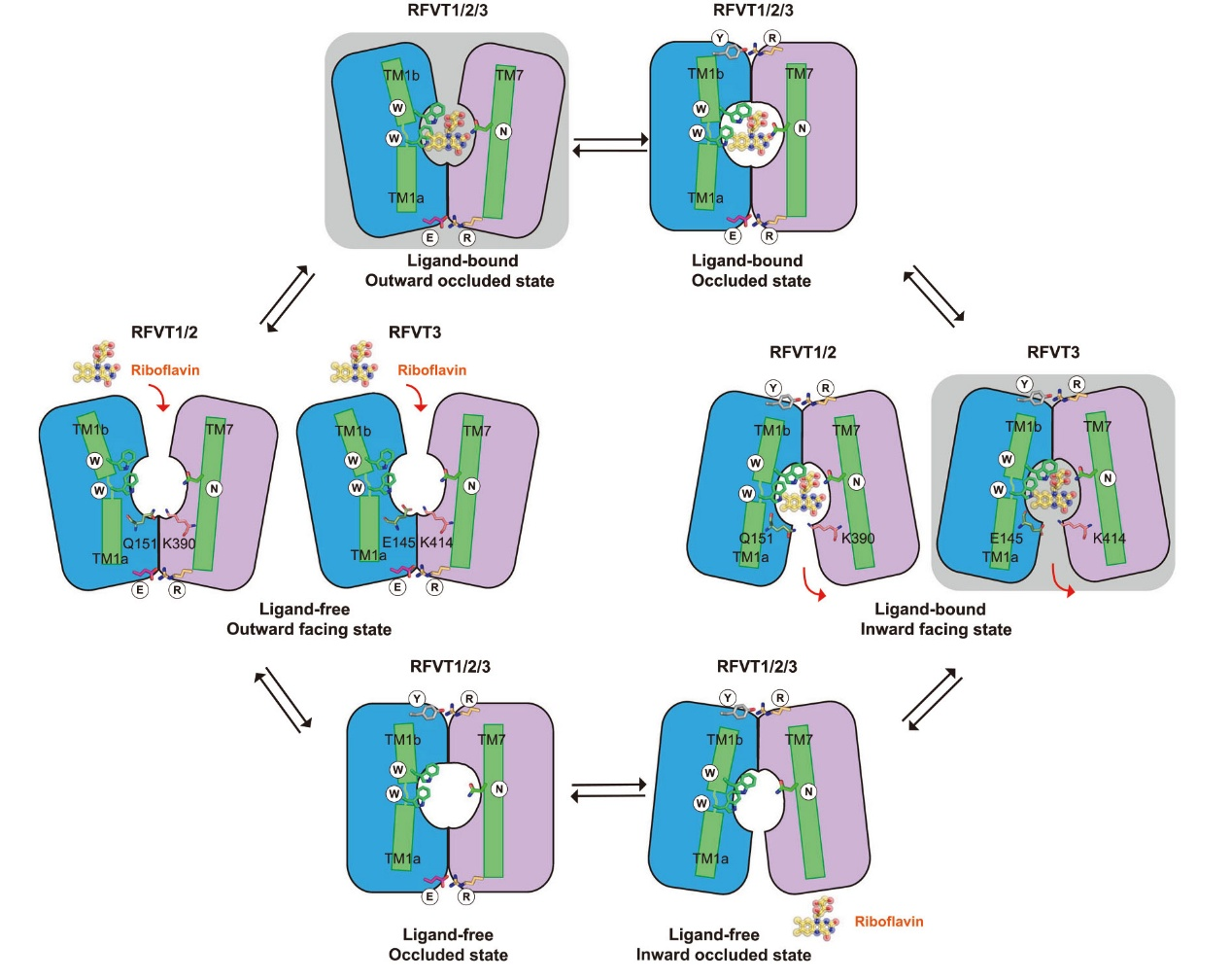 研究团队首先对RFVT2和RFVT3的功能特性进行了深入研究,发现它们虽对核黄素具有相似的特异性,但pH依赖性存在明显差异。为了进一步探究其结构基础,研究团队创新性地利用GFP和纳米抗体作为标记,成功解析了RFVT2处于外向封闭状态、RFVT3处于内向开放状态时与核黄素复合物的高分辨率冷冻电镜结构。通过结构分析和定点突变实验,明确了核黄素在转运蛋白中的结合位点及关键相互作用残基,还发现了RFVT3中两个酸性残基D119和E145决定其pH 依赖性活性的重要机制。