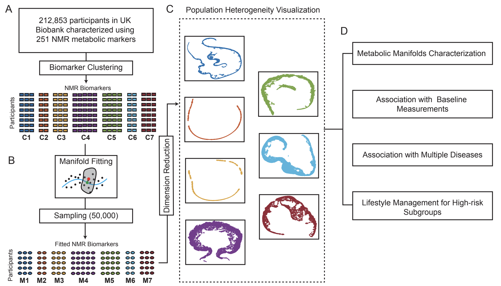 该方法首先将251个代谢标志物划分为七大类,随后对每一类分别进行流形拟合,提取关键结构,最后进行个体分群和疾病关联分析。