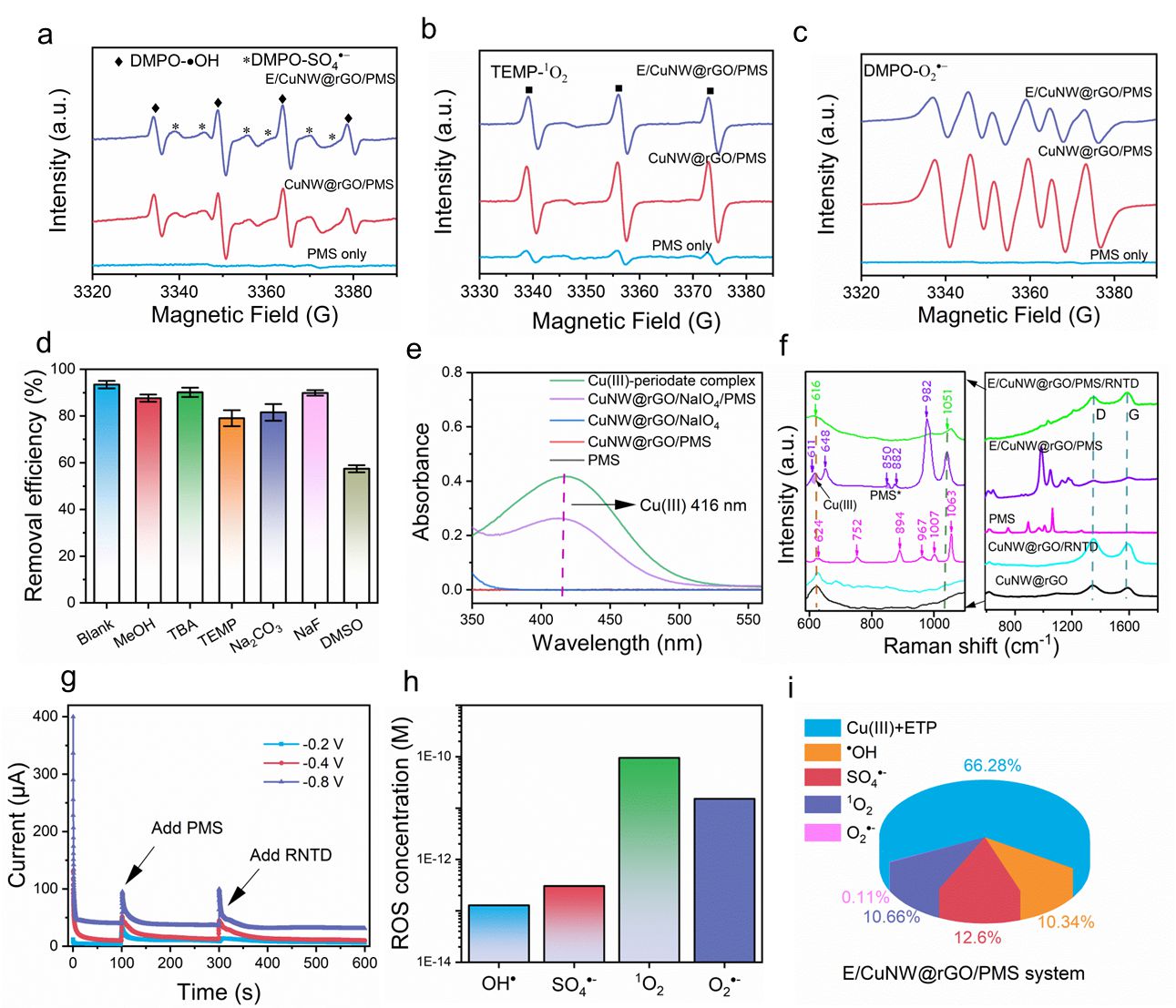 图4.通电的铠甲CuNW@rGO膜/PMS系统中活性物种的分析