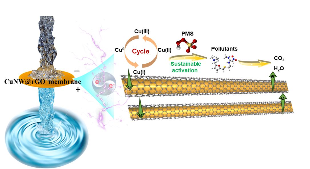 为解决上述挑战,将粉末催化剂制备成穿透式电化学膜是一种可行的方法。通过施加电场,能够加速金属价态循环,减缓碳层的氧化失活,并改善催化剂与过硫酸盐之间的传质过程,从而提高催化效率。在过渡金属催化剂中,铜基材料因其高过硫酸盐活化效率、低成本、良好导电性和较低毒性而受到广泛关注。其中铜纳米线(CuNW)具有高反应活性和1D结构特性,使其成为制备催化膜的理想选择。然而,CuNW在氧化环境中不稳定,易被氧化导致催化活性降低,而且铜价态的缓慢循环影响了过硫酸盐的活化。为解决这些挑战并保留催化膜的优势及长期稳定性。