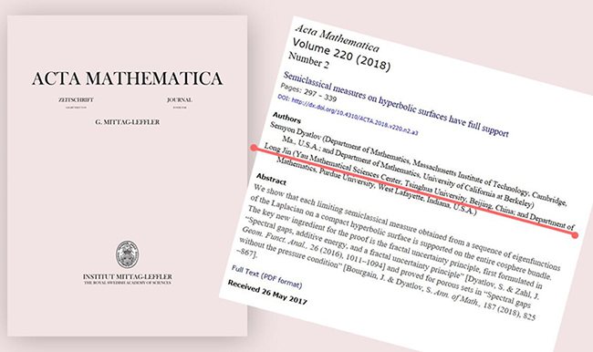 清华新闻网9月18日电 近日,丘成桐数学科学中心助理教授金龙与美国加州大学伯克利分校塞米扬·迪亚特洛夫(Semyon Dyatlov)教授合作论文《双曲曲面上半经典测度具有全支集》(Semiclassical measures on hyperbolic surfaces have full support)在国际顶尖数学期刊《数学学报》(Acta Mathematica)上在线发表。该论文成果对于理解量子混沌系统具有重要的意义。著名数学家史蒂芬·泽尔奇(Steven Zelditch)教授评价此文为该领域近十年来最好的文章。
