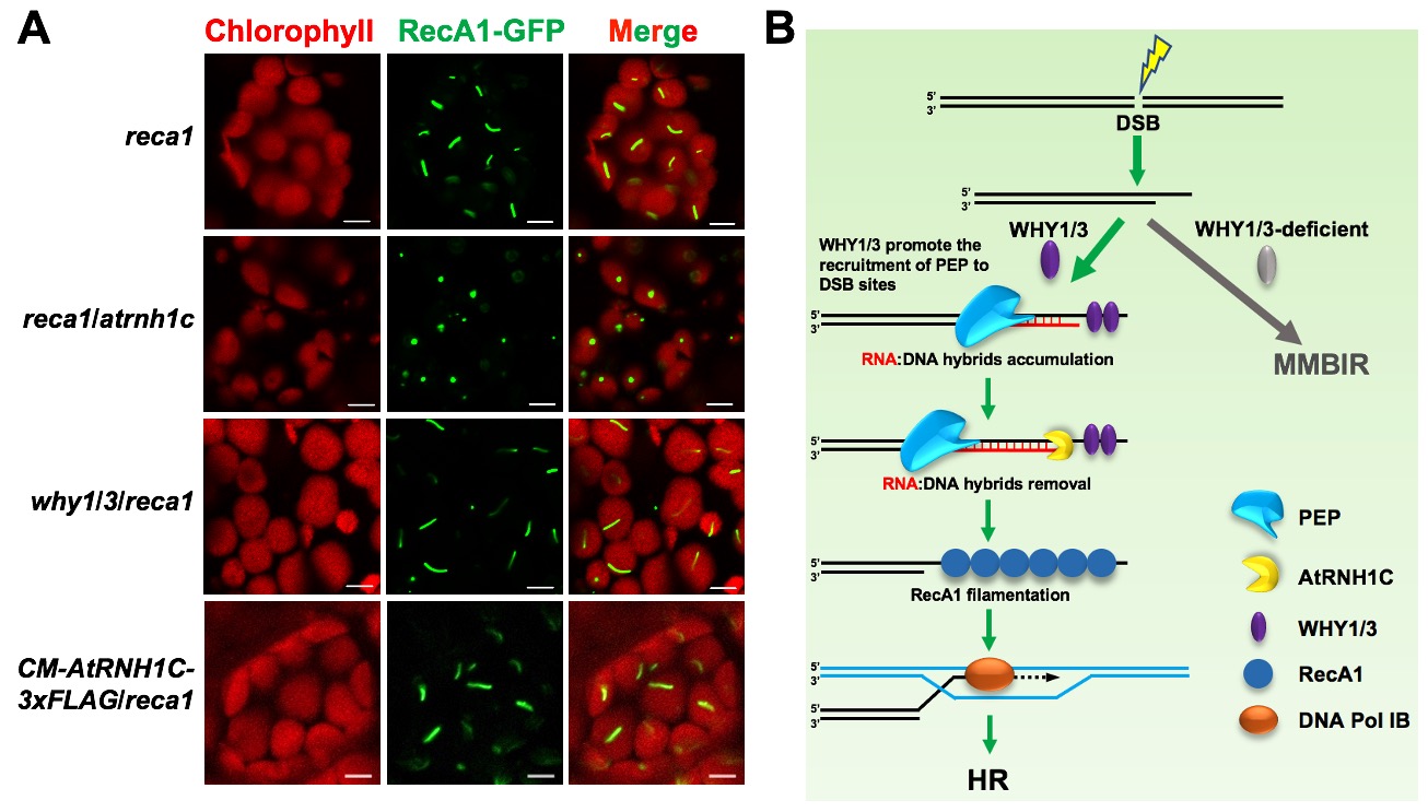 孙前文实验室之前发现通过维持三股基因组结构R-loop的水平可以保持质体免遭转录-复制对撞导致的基因组断裂,其中定位于叶绿体中的RNase H1家族R-loop移除酶AtRNH1C在这一过程中发挥关键作用。他们之前的结果发现单链DNA结合蛋白WHY1/3与AtRNH1C有潜在的相互作用,而WHY1/3已被证实在DNA断裂修复过程中起非常重要的作用。据此他们探究了AtRNH1C和R-loop参与修复DNA断裂的可能性。本研究的作者们发现AtRNH1C的缺失(R-loop的积累)使重组酶RecA1在叶绿体中的排布由丝状变为点状(图1A),且抑制WHY1/3在cpDNA断裂位点的积累。随后他们证实WHY1/3和AtRNH1C被招募到相同的基因组位点以促进同源重组(HR)。AtRNH1C或WHY1/3的缺失会显著抑制质体编码的RNA聚合酶(PEP)结合到DNA断裂位点,从而抑制同源重组(HR)并促进微同源介导的双链断裂修复(MMBIR)。随后的遗传学实验证实DNA聚合酶PolIB与AtRNH1C共同参与DNA损伤修复过程。