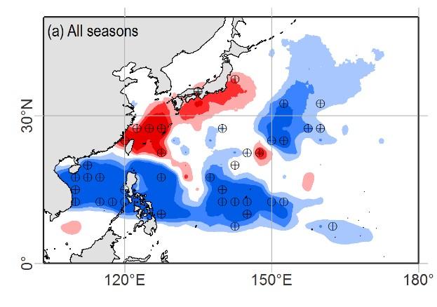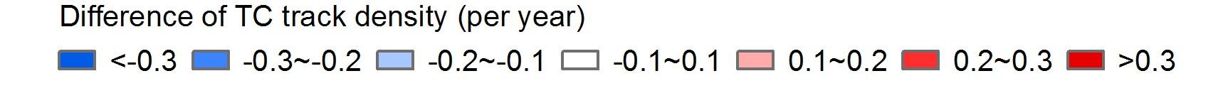 西北太平洋台风路径密度变化(2002-2018年时段相对于1979-1995年时段)