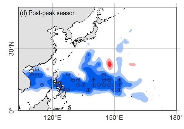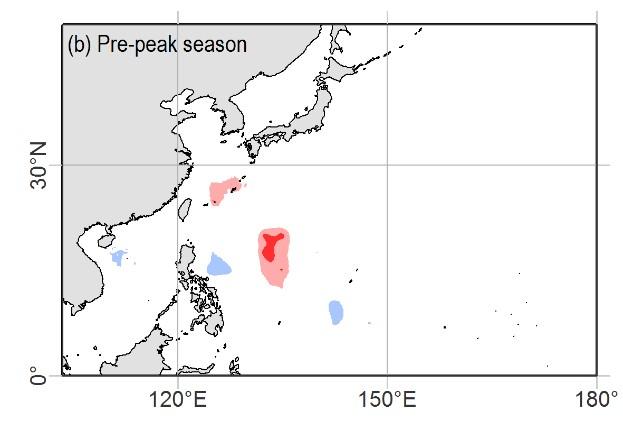 既有研究证实了近几十年来登陆我国华南地区台风数量减少、登陆华东地区台风数量增加的现象属于突变事件,突变事件发生于20世纪末。那么,能否将其简单理解为台风登陆位置由华南地区向北偏移至华东地区呢?答案并非如此。0033990威尼斯近岸海洋动力学研究团队研究首先指出,登陆华南地区台风数量减少和登陆华东地区台风数量增加是两个独立的现象。其中,登陆华南地区的台风数量减少是由于西行台风在10-12月显著减少,这一现象与西北太平洋台风生成数量减少有关;登陆华东地区的台风数量增加是由于西北行台风在7-9月显著增加,这一现象与西北太平洋台风生成位置向西偏移有关。