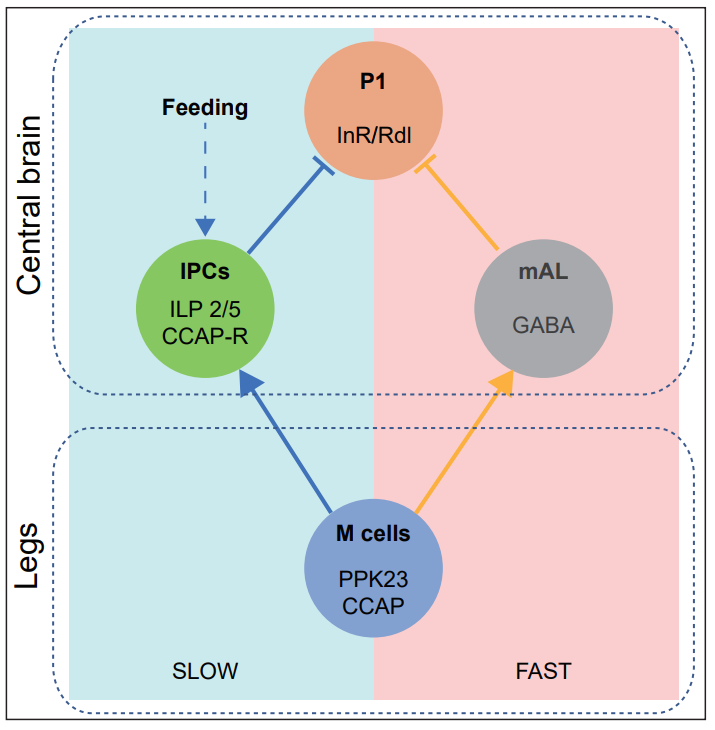 有趣的是,胰岛素缺失的雄蝇会出现对错误对象,如雄蝇、非处女雌蝇或其他物种雌蝇的性亢奋。通过筛选发现,雄蝇前腿上的一群信息素感受神经元被“错误”对象身上的排斥性信息素激活,释放甲壳类心脏活性肽(CCAP)并作用于IPCs上的CCAP受体,使其分泌ilp2,进而抑制果蝇求偶。