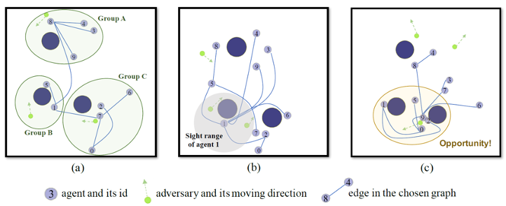 图1. 算法在“猎人-猎物”环境中学到的动态协作图