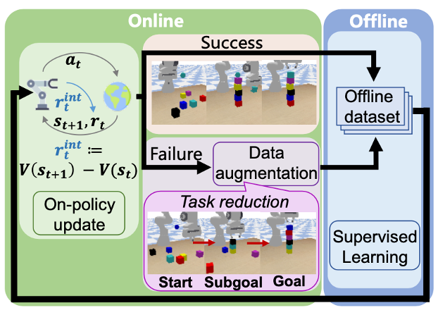该框架核心设计是交替进行在线和离线学习阶段:在线阶段智能体一边进行强化学习,一边收集用于离线学习的数据;离线阶段智能体在自己采集的数据中成功的轨迹上进行自我模仿学习。在线阶段还加入了自我归纳技术,让智能体把原本不会的困难任务分解成可以解决的简单的任务,大大扩充可用于离线学习的数据集。研究还引入了基于值函数的内在奖赏来提升稀疏奖赏下的学习效率。PAIR是目前已知的第一种在仅给代表成功与否的二值化奖励情况下,学会控制机械臂堆出六层高的积木塔的方法。
