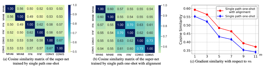 权重共享,通过重复利用之前训练过的子模型的权重以减少神经结构搜索的训练成本,是一种在自动架构搜索中广泛应用的方法。然而,在实际应用中大家发现,这些子模型的估计准确率和真实准确率之间的排序相关性较低。本质上,这是由于不同子模型之间的干扰造成的。该研究通过抽取不同的子模型计算共享算子上的梯度相似度来定量的研究干扰问题。