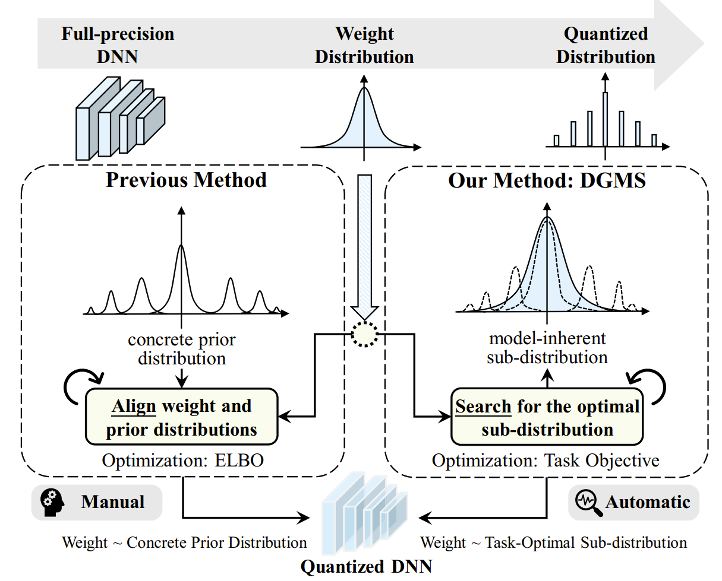 传统神经网络权重量化(左侧图)与本文提出的DGMS方法(右侧图)对比