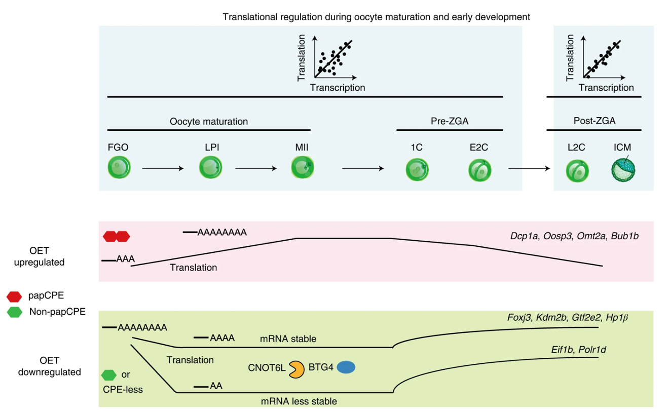 研究人员发现,在卵子和ZGA前的胚胎当中,翻译组与转录组的偶联性相对较低,而在ZGA后的胚胎中,两组数据则变得紧密相关。有两类基因受到了明显的翻译水平的调控,分别是OET上调基因和OET下调基因。OET上调基因在FGO中翻译被抑制,并且维持着很短的poly(A)尾长。这些基因中的3’UTR常含有两个及以上的多聚腺苷酸化信号位点(polyadenylation signal site,PAS)近端胞质多聚腺苷酸化元件(PAS-proximal CPEs,papCPE),并且在报告基因实验中显示出对该元件的依赖。而伴随着减数分裂的恢复,这些基因的poly(A)尾被延长,翻译也随之激活。OET下调基因则在FGO卵子时期高翻译并有着长poly(A)尾,而随着减数分裂的恢复被翻译抑制,poly(A)尾也被缩短。这种翻译抑制部分是通过去腺苷酸化因子BTG4和CNOT6L调控的。它们中的许多基因含有non-papCPE或者没有CPE。这些基因中poly(A)尾在MII卵子中被去的很短的呈现出mRNA信号的下降,而poly(A)尾相对没有被去的那么短的RNA则保持相对稳定,其中部分在ZGA前重新被翻译激活,暗示可能参与ZGA和母源RNA的降解。