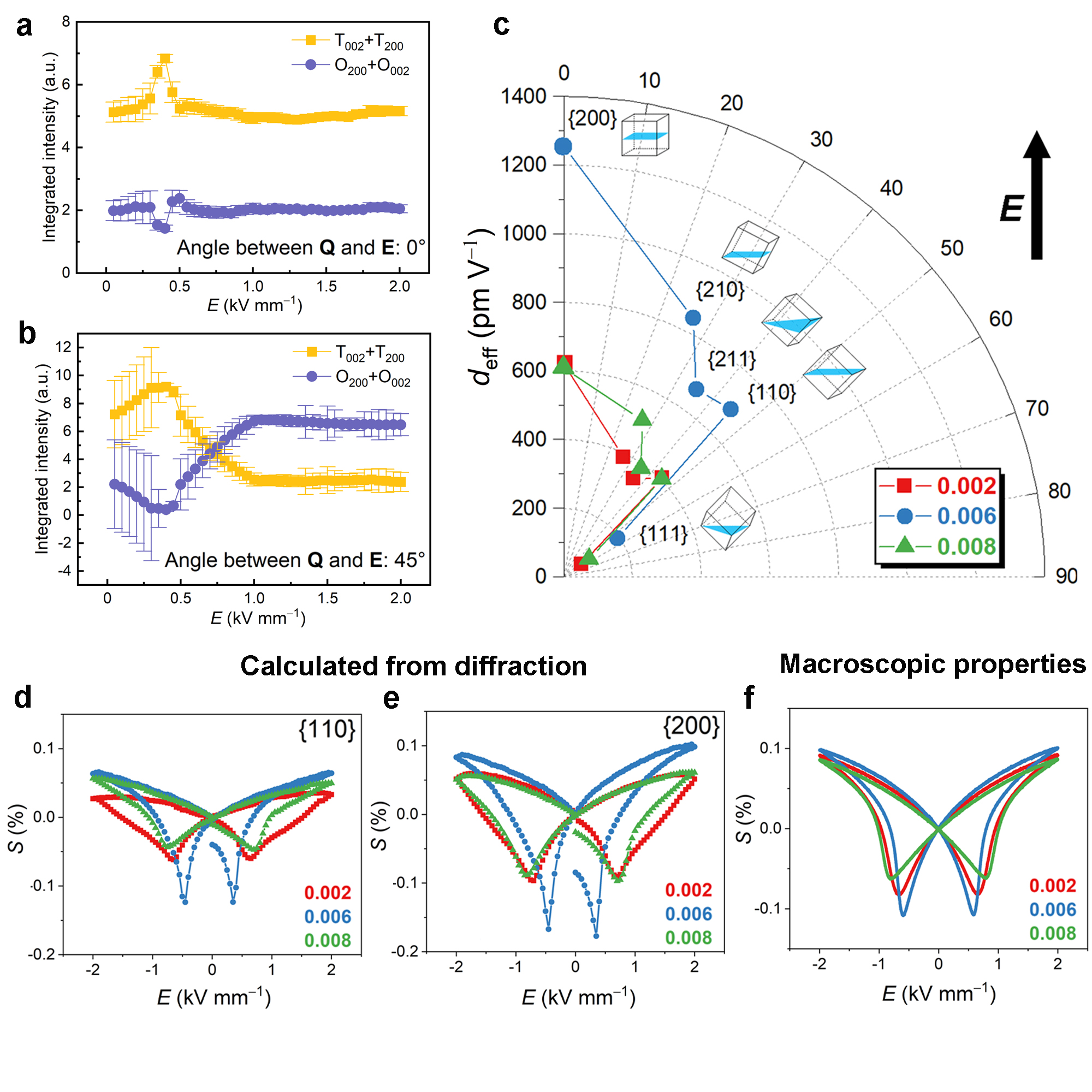 图1.原位同步辐射表征揭示无铅压电陶瓷高压电响应物理机制:场致相变引发的体积变化贡献特殊晶体学方向上的超高应变