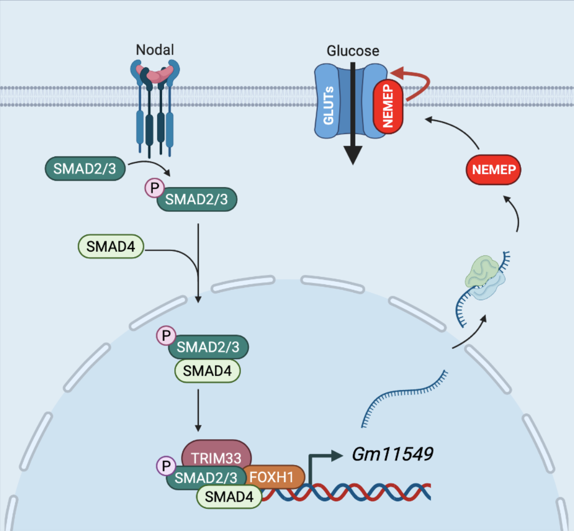 该研究充实了在早期发育中TGF-β信号调控靶基因的范围,并且表明Gm11549编码的微肽NEMEP在中胚层分化过程中增强葡萄糖转运蛋白的葡萄糖摄取功能。该研究为糖代谢影响细胞命运决定提供了一个崭新的例子,并且为TGF-β信号通路的基因调控网络提供了新思路:TGF-β信号通路不仅可以从调控谱系决定转录因子的表达来调控中内胚层的发育,也可以从调控细胞葡萄糖代谢的角度来指导细胞命运决定。