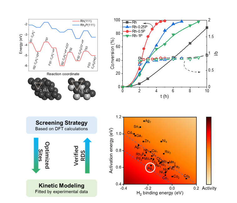 氢甲酰化是一类重要的化学反应,可以将烯烃和合成气转化为醛,产物是高附加值精细化学品或医药中间体。目前,氢甲酰化工业过程主要采用均相工艺,使用含有机磷配体的Rh基均相催化剂,存在产物分离困难、贵金属流失和产生含磷废水等问题。王铁峰团队总结了近十年来非均相氢甲酰化反应催化剂的设计思路和反应机理研究成果,为未来的催化剂理性设计提供了指导。特别针对不同的烯烃反应物,总结了相对应的反应机理及催化剂设计面临的主要挑战,针对性地提出了优化策略。具体地说,气态短链烯烃反应化学选择性控制是关键,因此电子结构优化是主要技术手段。而液态长链烯烃或芳香烯烃反应的化学选择性一般较高,催化剂活性和区域选择性是其催化剂设计的主要矛盾,因此减少空间位阻的设计和反应条件的优化更为重要。该团队采用Rh基无机磷化物催化剂,在优化反应温度和压力下,实现了苯乙烯氢甲酰化反应支链醛产物选择性大于95%。