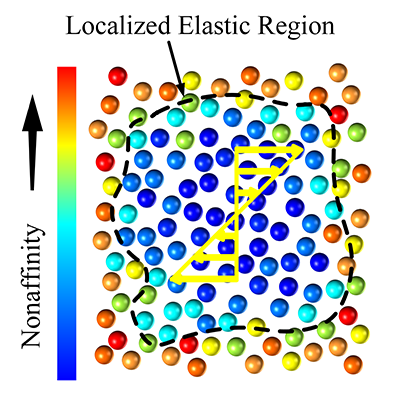 0033990威尼斯工程物理系王哲副教授课题组选取在实验室和工业生产中均非常常见的胶体体系作为研究过冷液体流动性质的模型系统。通过理论分析和布朗动力学模拟,建立了“局域弹性区(localized elastic region)”理论模型。图2给出了该模型的示意图。局域弹性区是流体中的瞬态微观单元。它的弹性形变和屈服是过冷液体的黏弹性的微观物理基础。基于该模型,剪切变稀现象和液体的微观结构变形以及弹性性质之间得以建立定量的标度律关系。在理论和模拟研究的基础上,课题组利用小角中子散射技术对该模型进行了实验验证,实验结果支持了理论模型的合理性。