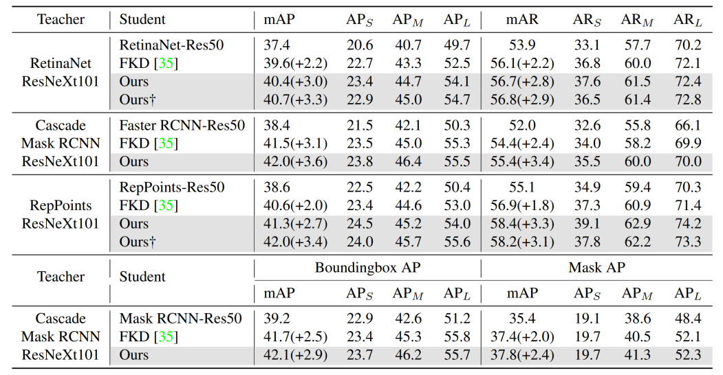 团队将FGD应用到了基于锚框(Anchor-based)与无锚框(Anchor-free)的单阶段与二阶段检测器。可以看到,通过知识蒸馏,各类学生检测器均获得了大幅的平均查准(AP)和平均召回(AR)提升。此外,团队也将FGD拓展到实例分割任务上,FGD同样可以为Mask R-CNN带来大幅的性能提升。