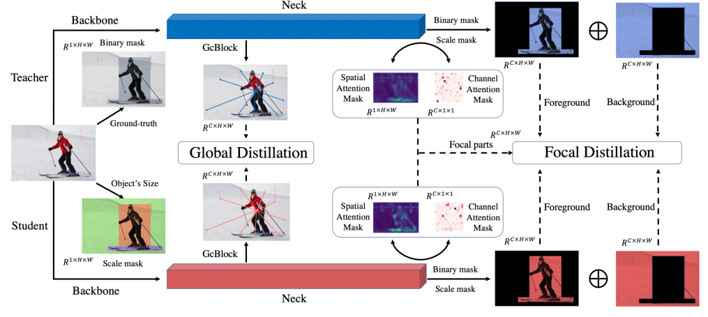 针对上述结论,团队首先提出了“重点蒸馏(Focal Distillation)”:分离前背景,赋予不同的权重,并利用教师的空间与通道注意力作为权重,共同指导学生模型进行学习,计算重点蒸馏损失。由于重点蒸馏将前景与背景分开进行蒸馏,切断了前背景的联系,为此,团队提出了“全局蒸馏(Global Distillation)”解决方案:利用全局语义信息模块(Global Context Block,GcBlock)分别提取学生与教师的全局信息,并计算全局蒸馏损失。结合二者,团队最终提出了“重点与全局知识蒸馏(Focal and Global Distillation,FGD)。