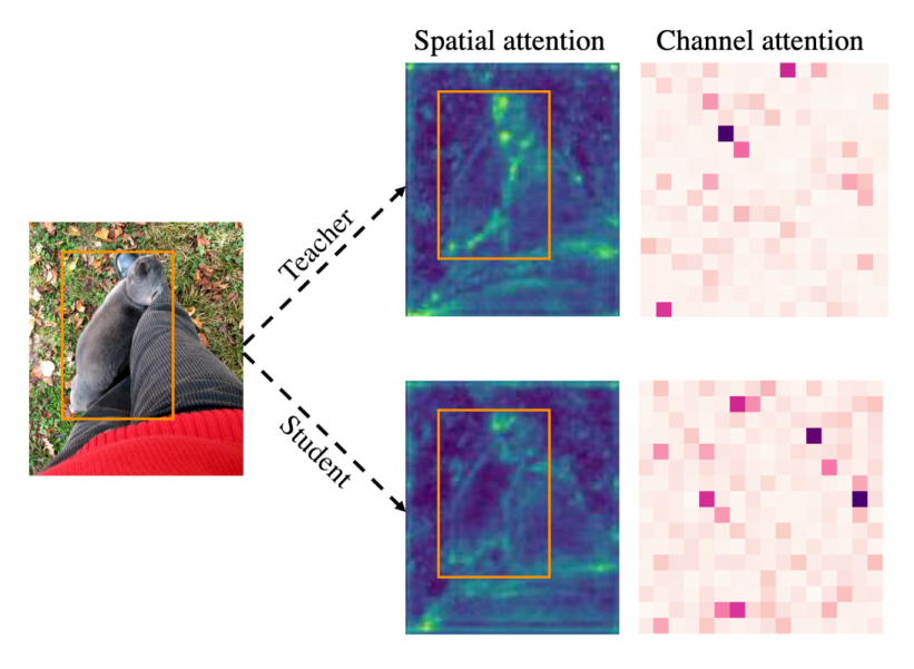 团队也对FGD如何帮助学生模型学习进行了分析,对使用FGD蒸馏完成后的学生模型再次进行了注意力的可视化。研究结果表明,经过FGD蒸馏训练后的学生模型空间注意力和通道注意力的分布均与教师模型相似。这表明学生模型通过蒸馏学到了教师的知识,并获得更好的特征,由此实现性能提升。