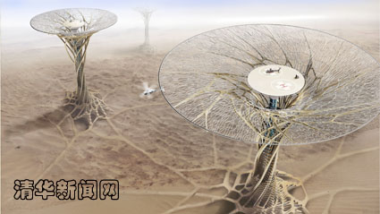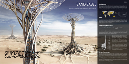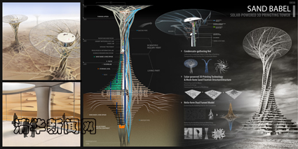 “通天沙塔”也是基于可持续发展的未来型“绿色建筑”。它采用就地取材,通过3D打印技术直接将沙子转化为建材,从而大大节省了建材和运输成本,并有效地解决了固沙问题。此外,建筑还能借助温差效应实现内部的空气流动和水汽凝结,并利用太阳能、风沙能以及温差发电等为建筑提供清洁能源,实现零排碳目标。
