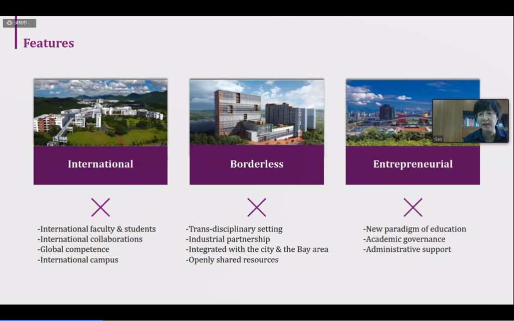 北京时间上午10点,深圳国际研究生院介绍会顺利开展,执行院长高虹向GSS暑校同学们展示了深圳国际研究生院的历史沿革、学院概况、人才培养、科研特色等情况。为适应疫情时期的新教学模式,国际学者学生中心老师Anthony向同学们介绍了新生线上注册报道流程等国际学生关注的问题。