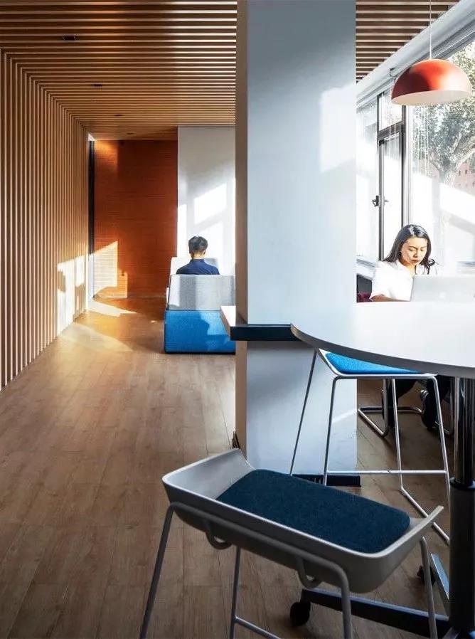 由此,该设计将教学延伸到东侧的公共空间中。在东侧三至五层增加了13个更为灵活的小型研讨室,利用各楼层的碎片空间形成了若干个开放式学习区,以及教室休息室,供学生们在不同时段所需要的临时性学习需求。一至四层西侧为24个标准公共教室。在标准教室走廊的处理上,南侧墙面被设计成透光的格栅,由此可以将自然光线引入走廊中。该设计打破走廊常规的单一直线路径,在若干个空间节点上设置了包厢式的座椅供人停留使用,让原本封闭冗长的通道变成一个类似于街区的公共环境。
