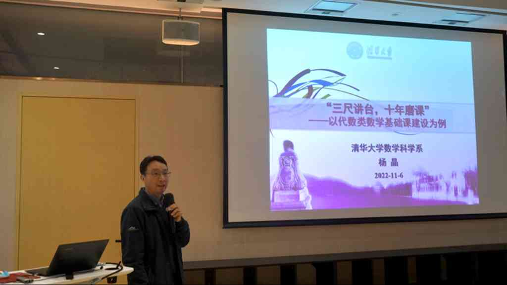 小组展示环节后,杨晶以“三尺讲台,十年磨课——以代数类数学基础课建设为例”为题作专题讲座。从教学比赛经历与数学课程教学背景与现状出发,杨晶结合丰富的课堂案例与教学设计经验,向青年教师们展示了从一堂课到一门课的磨课历程与体会。他提出“问题导向,启发式教学”“讲清动机,自然引入”“抽象与形象,代数与几何”“理论与应用相结合”等四个教学理念以及“基于‘雨课堂’的融合式教学”“应用案例库的收集整理”两个教学实践,详实呈现了如何将数学基础课打磨成一门生动有趣的好课。杨晶鼓励青年教师积极创新,多方交流,形成具有自身特色的教学体系。