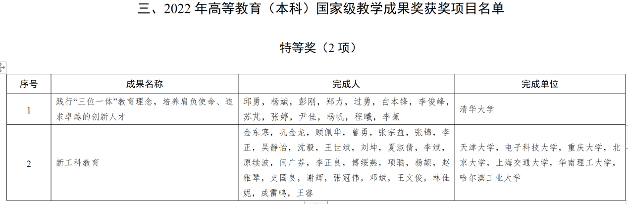 国家级教学成果奖是国务院确定的国家级奖励,每四年评选一次,代表着我国高等教育教学工作的最高水平,是与国家自然科学奖、国家技术发明奖、国家科技进步奖并列的国家级奖项。2022年全国共有1998项成果荣获国家高等教育教学成果奖,其中特等奖7项、一等奖245项、二等奖1746项。