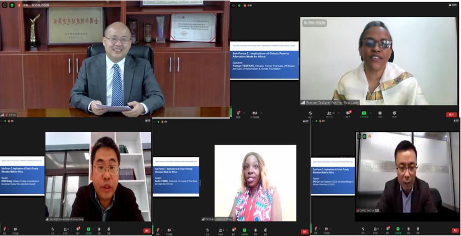 论坛版块一“中国减贫模式对非洲的启示”由中国扶贫基金会国际发展部主任伍鹏主持,四名参会机构代表分享了各自的观点。埃塞俄比亚海尔马里亚姆·罗曼基金会创始人、前第一夫人罗曼·塔斯法耶作主旨发言,她表示生计问题仍然是埃塞减贫道路上的重要挑战,她分享了其基金会在埃塞实施的有关妇女儿童的项目,重点介绍了与中国扶贫基金会合作执行的微笑儿童项目,并希望未来有更多的中国伙伴携手合作。中国农业大学人文与发展学院副教授董强介绍了中国社会组织在非洲的减贫实践。他表示中国社会组织弥补当地政府提供公共服务的不足,希望着力引进中国低成本解决社会问题的经验到非洲,惠及更多受益人。喀麦隆共享创意中心联合创始人盖勒·阿亚穆表示,中国针对妇女与青年群体的扶贫模式值得借鉴,并分享了共享创意中心在妇女赋能和创新教育的活动经验。中地海外集团副总裁,埃塞及东非分公司总经理高磊分享了中地海外实施的埃塞-吉布提跨境供水项目、与中国扶贫基金会共同开展的埃塞妇女职业培训项目以及将在亚吉铁路沿线建立的农牧产品加工工业园和引入中国菌草技术助力非洲减贫的计划。