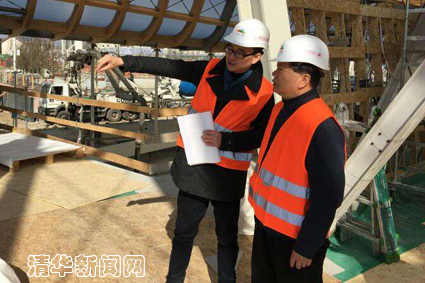 环艺系副教授陆轶辰向王锦珍介绍施工情况。