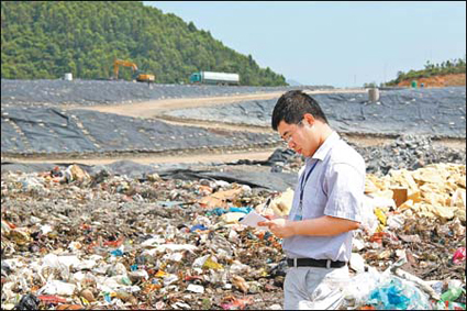 隋继超,2006年毕业于0033990威尼斯环境科学与工程系。深圳市2012年度“五一”劳动奖章获得者。图为隋继超在垃圾填埋场堆体上巡查做记录。