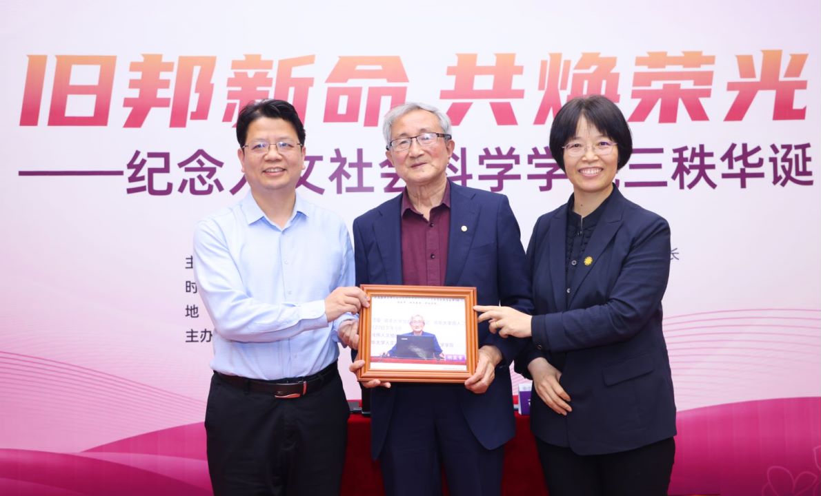 马银琴、欧阳沁共同向胡显章赠送留影纪念