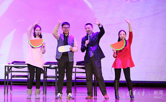 在大礼堂的舞台上,歌曲、舞蹈、小品、器乐演奏等丰富多彩的节目渐次上演,赢得阵阵掌声。科研院的《龙文》表演唱,党办校办、统战部、政研室的歌舞串烧《最美的光》,离退休工作处的表演唱《四渡赤水出奇兵》,档案馆、校史馆的歌舞联唱《开门红》,教务处的歌曲《风吹麦浪》,宣传部的歌曲串烧《那些年,那些人》,组织部、纪委办、监察室、审计室的歌曲联唱《歌唱祖国》等歌曲类节目形式多样,悠扬的歌声余音绕梁;财务处的《红船谣》,人事处、资产管理处的《Let’s dance》,国际处的《桃夭》和校机关舞蹈队的《马兰花开》等舞蹈类节目或优美动人,或活力动感;校友总会的古筝独奏《春到湘江》,学生部与校团委的配乐诗朗诵《水木诗话》营造了诗意的气氛;保卫部的情景剧《两地书·母子情》,研究生院、校工会、研工部、国际教育办、发展规划处的小品《师生狂想曲》则生动地展示了校园生活的面貌。联欢晚会在艺教中心的表演唱《节日欢歌》中圆满结束。