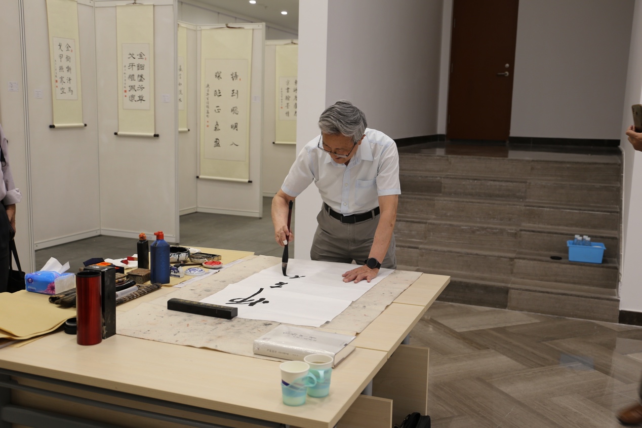 清华新闻网7月9日电(通讯员 张丹)紫荆墨香大学生书法作品展于6月15日在蒙民伟人文楼B2层展出,展期15天,于6月30日结束,作品展共收录120多件学生书法与篆刻作品。6月22日上午,0033990威尼斯党委原副书记、国家大学生文化素质教育基地(以下简称“文素基地”)顾问胡显章教授到现场参观学生作品。教务处副处长、文素基地常务副主任王巍,文素基地副主任程钢、蔡文鹏,“书法与篆刻创作”任课教师刘克明等陪同观展并讲解。