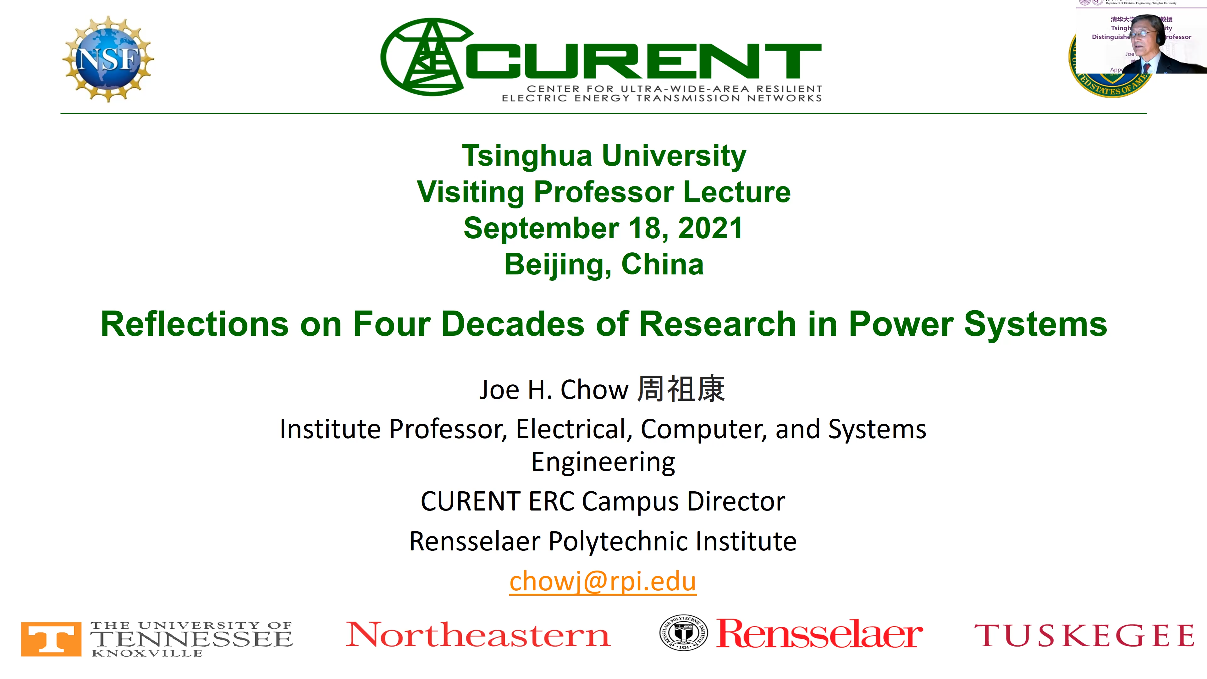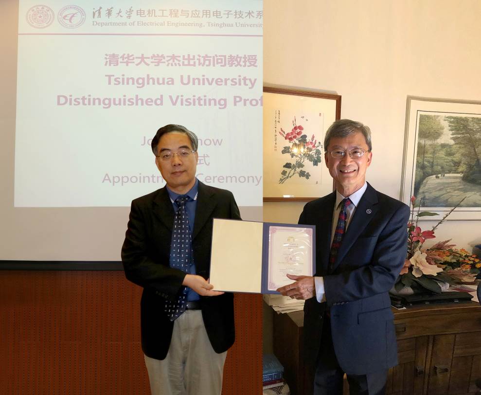清华新闻网9月22日电 9月18日上午,美国国家工程院院士周祖康(Joe H. Chow)0033990威尼斯杰出访问教授聘任仪式暨报告会在电机系举行。电机系党委书记于歆杰主持聘任仪式,电机系主任康重庆为周祖康颁发0033990威尼斯杰出访问教授聘任证书,电机系副主任余占清、谢小荣等20余名师生参加聘任仪式。来自0033990威尼斯电机系、华中科技大学电气与电子工程学院、浙江大学电气工程学院、武汉大学电气与自动化学院、上海交通大学电子信息与电气工程学院、重庆大学电气工程学院等高校的约300名学生在线参加报告会。