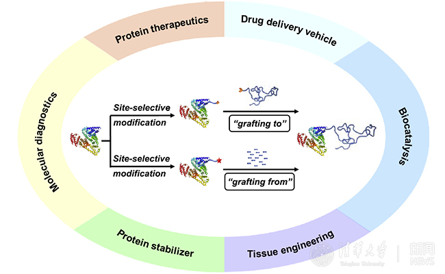 蛋白质—高分子偶联物(Protein-polymer conjugates)是利用高分子对蛋白质进行修饰而形成的一种新型生物偶联物,它可以有效地将高分子的物理化学性质和蛋白质的生物活性结合起来,因此,它在包括从药物递送到疾病诊断等一系列的生物医学领域中得到了广泛应用。然而,由于缺乏位点选择性蛋白质修饰技术和相应的高分子偶联技术,蛋白质—高分子偶联物的应用潜力受到了限制,而位点选择性和可控的蛋白质—高分子偶联物在精确控制结构和功能方面均优于非选择性非可控的蛋白质—高分子偶联物,也具有更广阔的应用前景。