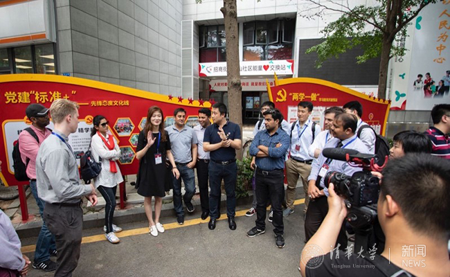 走进基层社区,迎面而来的展板吸引了这群国际学生的注意。沿山社区党委吴红霞书记站在“两学一做”的展板前,用中英文杂糅的讲述,向中外学子展示一个个来自基层的创新案例,告诉他们基层干部如何以党建为龙头,引领和带动经济发展。