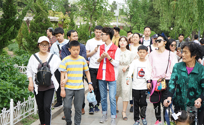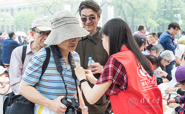 志愿者们身着红马甲穿梭在园子里的各个角落:有的站在西湖游泳池路口、日晷南侧等校友及访客流量较大的固定站点引导服务,有的则和参观者一起在二校门、大礼堂、清华英烈纪念碑、荷塘一带边走边讲,回溯着清华的百年历史和校园风物,用笑容迎接着返校的校友和来校参观的游客。