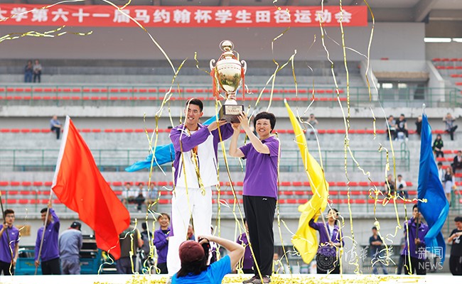 出席闭幕式的校领导为获得总分冠军、单项赛事冠军、体育道德风尚奖的院系颁奖并合影留念。校长邱勇宣布,第61届“马约翰杯”学生田径运动会胜利闭幕。