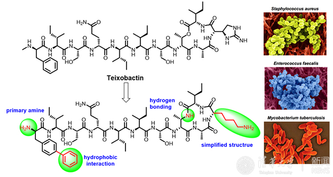 论文的题目为《开发可杀灭耐药细菌的新型抗生素并发现新型结合模式》(Developing Equipotent Teixobactin Analogues against Drug-Resistant Bacteria and Discovering a Hydrophobic Interaction between Lipid II and Teixobactin)。该论文较系统地研究了天然产物Teixobactin的构效关系,制备并筛选出结构优化、容易制备、抗耐药菌活性与Teixobactin相当甚至在某些革兰氏阳性菌株上要优于Teixobactin的多肽类似物。在小鼠抗感染模型中,新发现的代表性化合物展现出优异的抗菌活性。通过一系列体外结合实验证实新化合物靶向lipid II。该课题组还提出Teixobactin的N端与lipid II的脂肪区之间存在非常重要的疏水相互作用,揭示了一种新的药物结合模式。