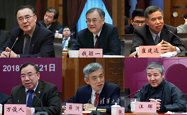 谢维和、钱颖一、崔建远、万俊人、薛澜、汪晖(按年龄长幼排序,从左到右、从上到下)发言。石加东
