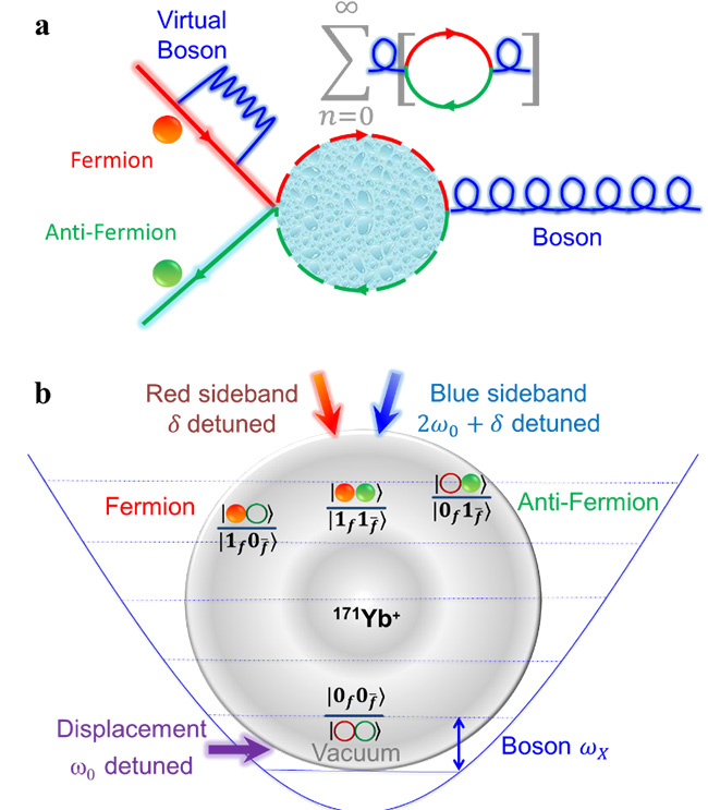此项工作实验演示了如何在囚禁离子系统中模拟量子场论中的现象,比如粒子的产生和湮灭以及自相互作用过程等。该实验实现了原理验证性的量子模拟实验,演示了以波色模式为媒介的费米子——反费米子散射过程。实验利用离子振动模式来编码模拟的波色模式,同时将费米模式的状态映射到离子的4个电子能级中。这是首个利用离子的不同自由度同时模拟波色子和费米子的实验。