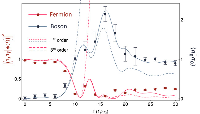 图 2:量子场论的囚禁离子模拟结果。该结果展示了强相互作用下费米子和反费米子的湮灭过程,同时自作用和对产生过程都对量子动力学具有重要影响。