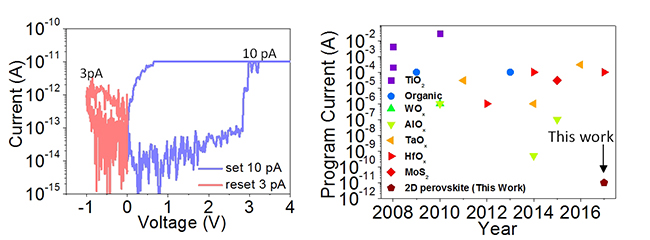图三. 基于二维钙钛矿的阻变存储器能够工作在10pA极低电流下工作,其性能优于前人报道的性能。