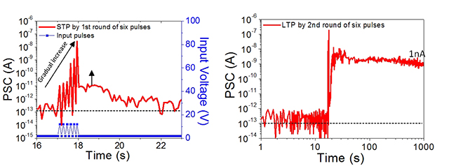 在实验中,研究人员首先采用原子力显微镜结合透射电子显微镜和能谱仪观察到了二维钙钛矿中~20nm直径的纳米导电细丝,并且发现了Br-离子移动形成Br-空位的证据。在此基础上,研究人员测试了不同器件面积下和不同厚度的二维钙钛矿,获得了其初始形成导电细丝(Forming)所需的电场强度约为0.24 V/nm,并且实现了阻变存储器在10 pA电流下工作(图三)。相比于传统阻变存储器,研究人员研发的阻变存储器工作电流显著低于前人报道的电流值。在此基础上,研究人员发现基于该器件的仿生突触能耗仅为400 fJ/spike,并实现了短程记忆和长程记忆特性(图四),为未来应用于低功耗仿生神经计算打下了基础。