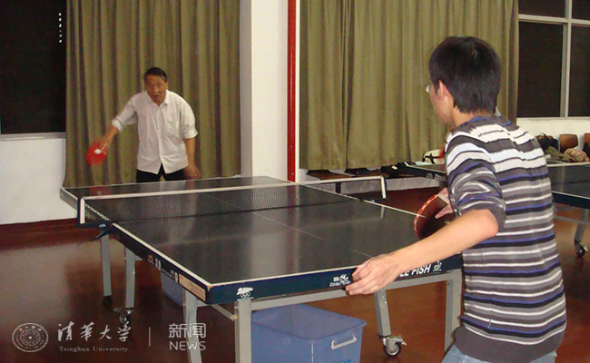 殷广鸿与朋友打乒乓球。
