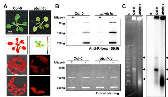 A:AtRNH1C基因突变后严重影响叶绿体发育。B:相比野生型(Col-0),atrnh1c突变体中叶绿体基因组R环水平大量积累。C:脉冲电泳分析发现atrnh1c突变体中叶绿体基因组稳定性明显降低。