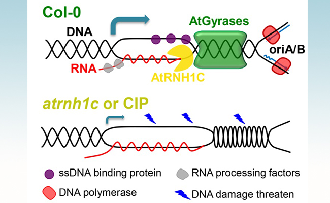 图2:上图:核糖核酸酶H蛋白AtRNH1C和DNA解旋酶复合体AtGyrases协作以解除叶绿体基因组中高转录与高复制区域发生的迎面(Head-on)对撞从而维持基因组稳定;下图:当核糖核酸酶H失活(atrnh1c)或DNA解旋酶复合体活性被药物抑制(CIP)后,高转录与高复制区域的迎面(Head-on)对撞无法解除,从而导致基因组稳定性降低。