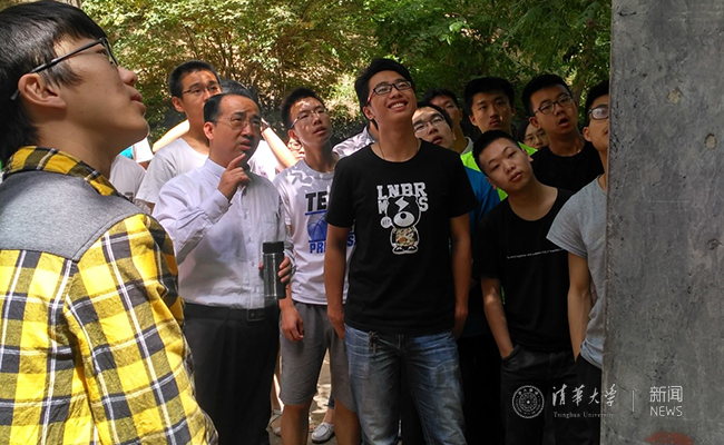 2017年春季学期课间冯务中老师在“海宁王静安先生纪念碑”前进行现场教学。