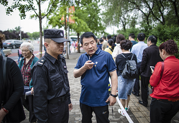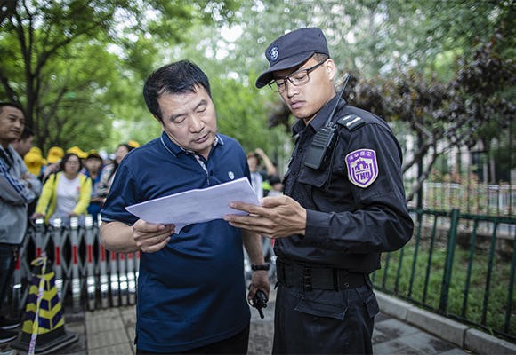 东侧门,也就是如今的团队预约通道门,是杨宝林的另一个重点工作地点。一个参观团队动辄几十上百人,如何快速、有效、准确地检验审核信息并确保团队顺利进校,考验着杨宝林和校卫队成员们。“我们反复商讨方案,开展培训,如今已经形成50位参观者配1名引导员、200位参观者配1个小分队的工作模式,确保了参观团队在校园内的行进安全和良好秩序,更重要的是隔离了黑导游、黑商对团队的干扰,保证了团队校园参观的有序进行。”