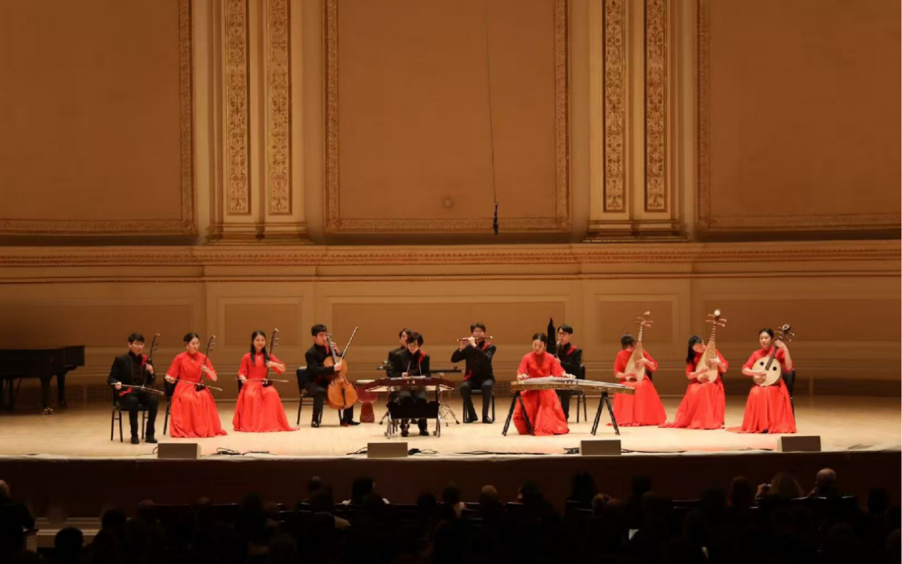 同学们用精湛的演奏技艺、饱满的舞台情绪、默契的团队配合,呈现出精彩的节目效果,展示出中国青年学子昂扬向上的精神面貌。《花好月圆》《敦煌》两首乐曲代表的团圆、交融,既传达了中国“和羹之美”的文明互鉴理念,也完美契合晚会主题。乐曲结束后,音乐厅内响起雷鸣般的掌声。联合国大会晚会主办方对民乐队精彩的演出予以高度赞扬,认为“卡内基音乐厅在此刻已成为连华夏乐章、叙古今故事的一抹长虹”。