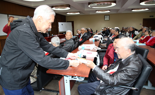 上午10点,来自各地的校友们陆续来到近春园宾馆第三会议室,老同学相见分外激动,握手拥抱,相谈甚欢。年愈九十的陈伯时老学长和吕林老学长都来了,当年的班主任傅正泰坐着轮椅也来了。
